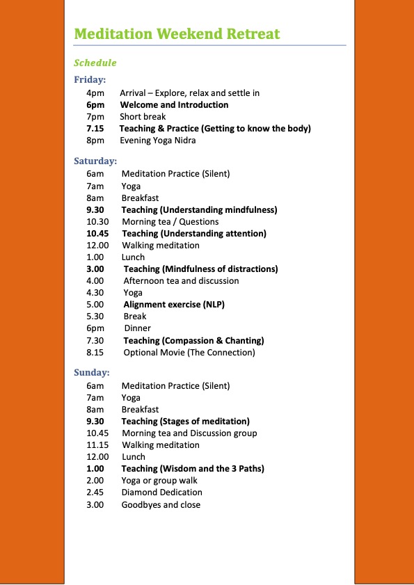 When available you can also ‘download attachment’ below for a schedule of the retreat. Please note that is is subject to change (due to weather or other circumstances) and retreat attendees will be will be provided with actual schedule on retreat. Sessions will vary depending on your choice of Meditation or Yoga retreat.